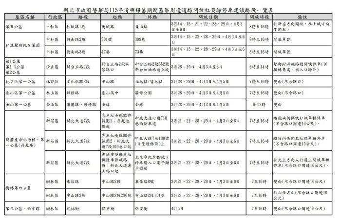 此外,為紓解停車需求,新北警彙整墓區周邊開放紅、黃線停車路段,供民眾就近停放,減少違規停車與交通壅塞。相關交通管制、接駁車資訊及停靠站,可至「新北市清明服務網」查詢(https://www.tfunscroll.ntpc.gov.tw/TombSweepingFestival/Default)。